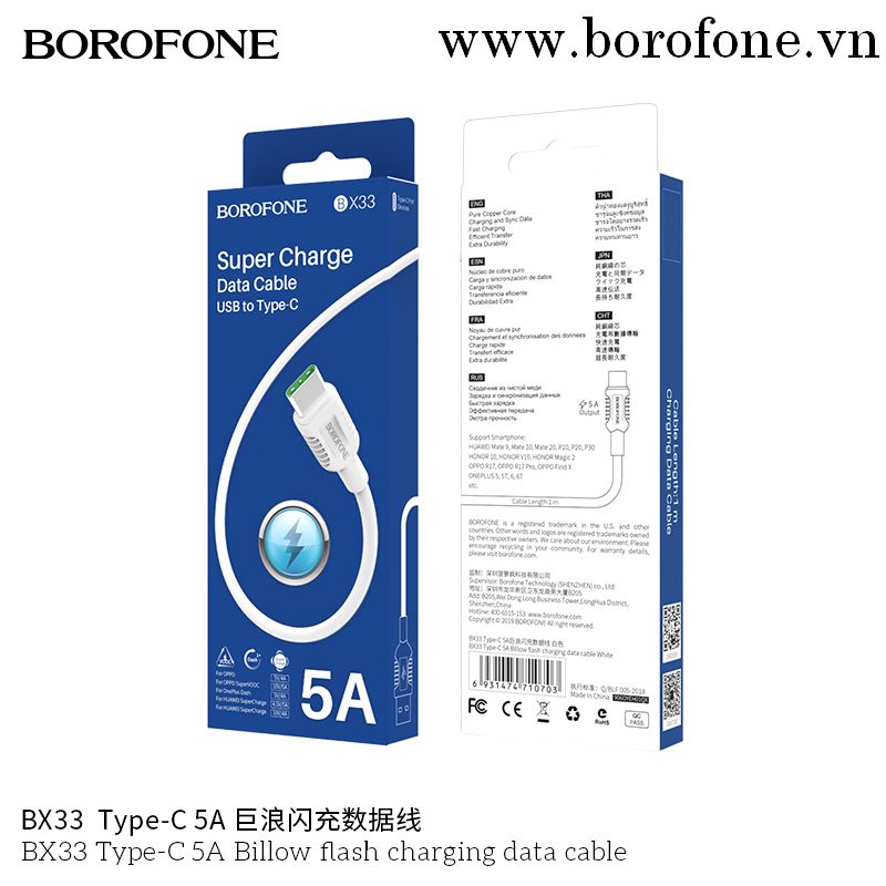 Cáp Sạc Nhanh BOROFONE BX33 Cổng Type C 5A 1.2M