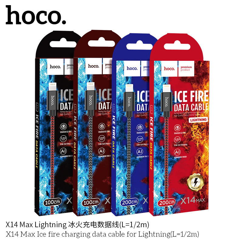 Model: X14 MAX Cáp sạc nhanh iPhone Hoco X14 MAX, hỗ trợ truyền dữ liệu, sạc nhanh 3A MAX Chất liệu: Dây bọc dù chống đứt chống rối Chiều dài: 1m hoặc 2m Tương thích: các dòng điện thoại Iphone sử dụng cổng sạc Lightning ( IP5 trở lên ) Điện áp: DC 5V – 3.0A Màu sắc: Đen - Đỏ