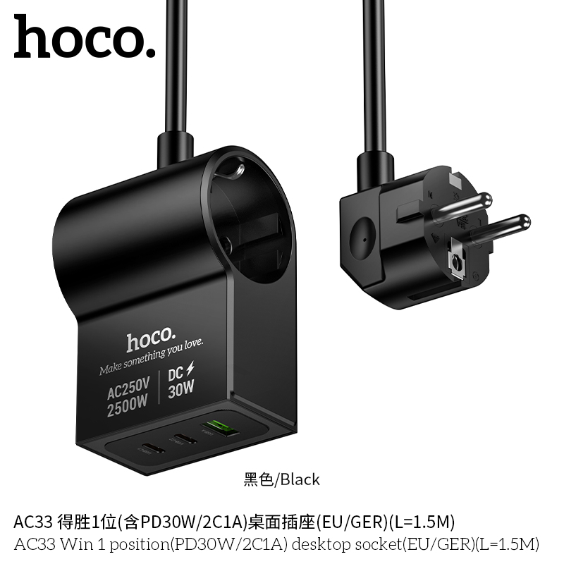 Ổ cắm để bàn Hoco AC33 Win 1 vị trí (PD30W/2C1A) (EU/GER) (Dài = 1,5M)