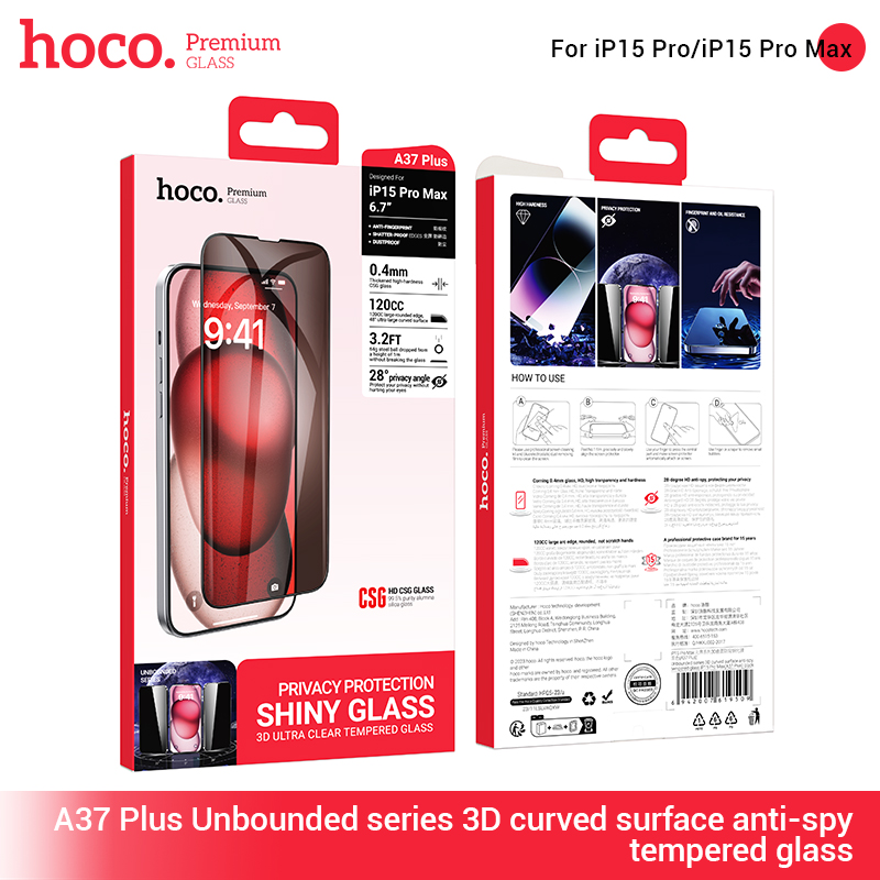 KÍNH CƯỜNG LỰC HOCO CHỐNG NHÌN TRỘM BỀ MẶT CONG 3D UNBOUNDED SERIES A37 PLUS IP15 PRO MAX